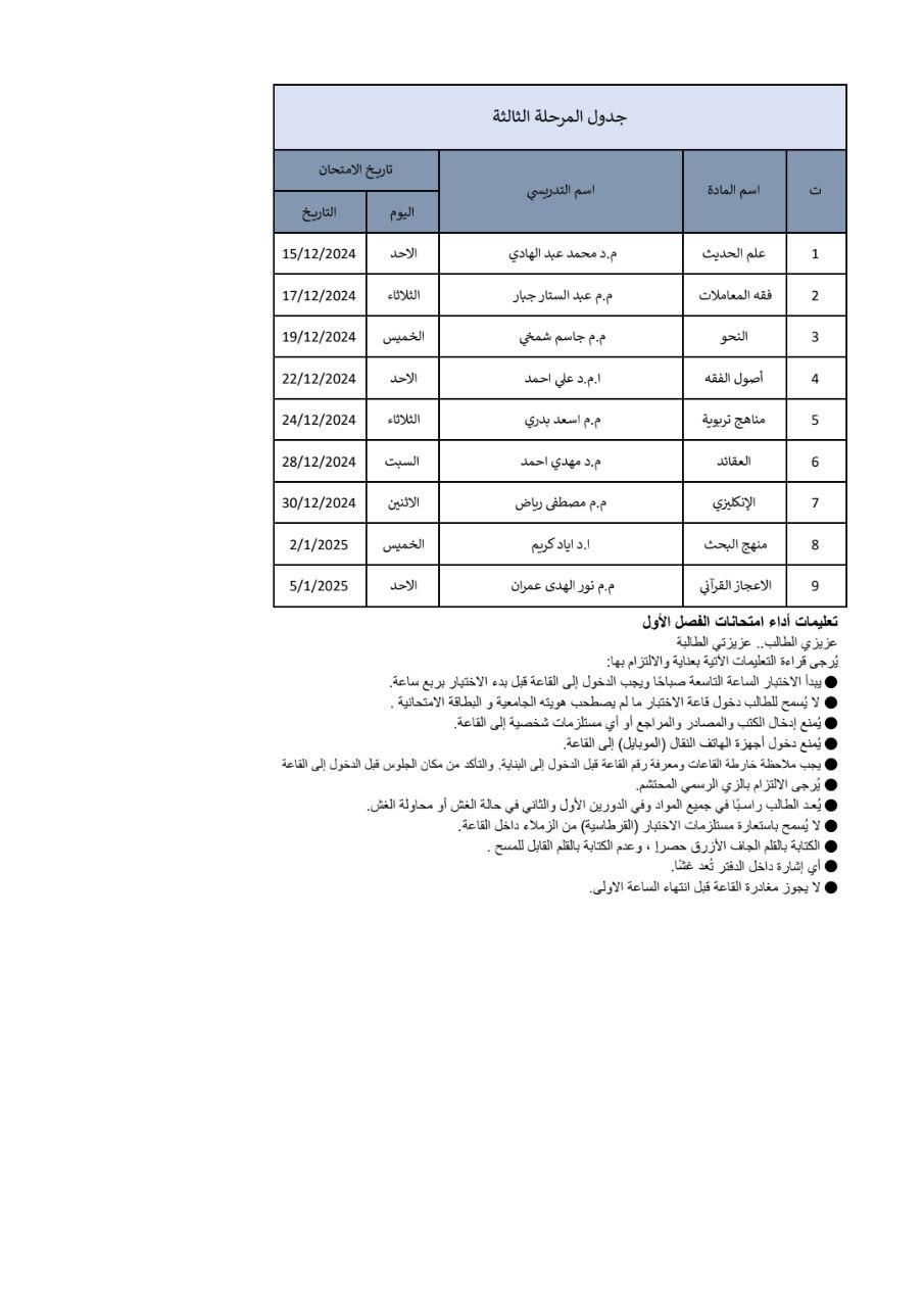 تعلن كلية العلوم الإسلامية في جامعة وارث الأنبياء (عليه السلام) عن انطلاق امتحانات الكورس الأول للعام الدراسي 2024-2025، وذلك ابتداءً من يوم السبت الموافق 14 ديسمبر 2024.