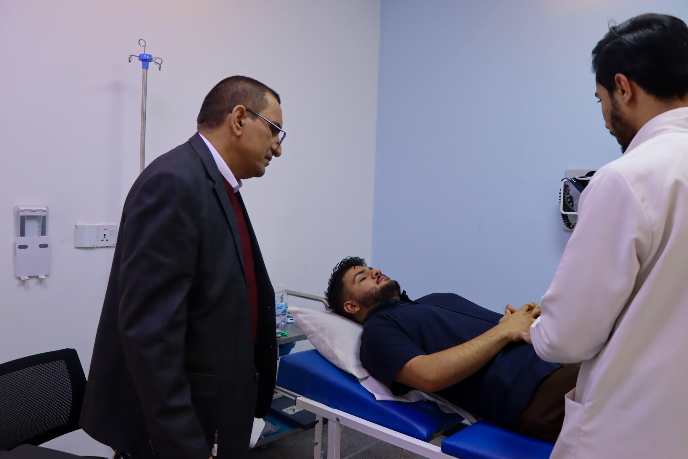 وشمل ذلك امتحان مادة الباطنية، الذي يُعد من الركائز الأساسية في التدريب السريري، حيث ركّز على تقييم مهارات الطلبة في أخذ التاريخ المرضي، وإجراء الفحص السريري الدقيق، وتحليل الحالات المرضية، ووضع الخطط العلاجية المناسبة وفق المعايير الطبية الحديث