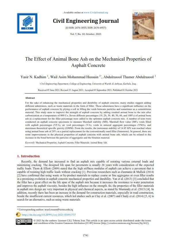 بحثاً علمياً باسم جامعة وارث الأنبياء (عليه السلام) بعنوان (The Effect of Animal Bone Ash on the Mechanical Properties of Asphalt Concrete)