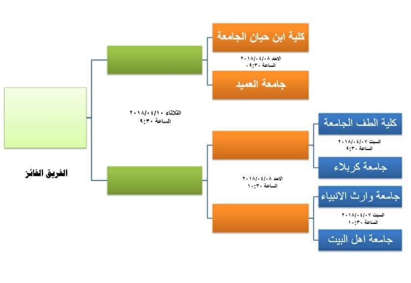 وقال م.م همام الخفاجي رئيس قسم النشاطات الطلابية ان الجامعات التي ستشارك في البطولة هي جامعة كربلاء وجامعة اهل البيت وجامعة العميد وكلية الطف وكلية ابن حيان وغيرها، وتم اجراء القرعة والاتفاق على شروط البطولة التي ستنطلق فعاليتها يوم السبت الموافق ٢٠١٨/٤/٧ على ملعب جامعة وارث الانبياء وستتضمن البطولة مباريات بنظام التسقيط الفردي