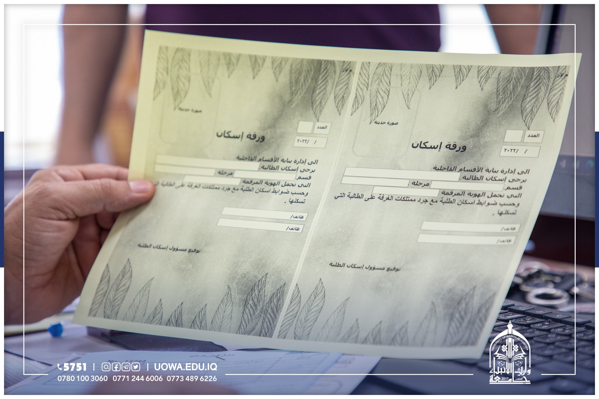 يستمر قسم شؤون الاقسام الداخلية في جامعة وارث الانبياء(عليه السلام) باستقبال الطلبة الاعزاء الراغبين بالتسجيل على الاقسام الداخلية.