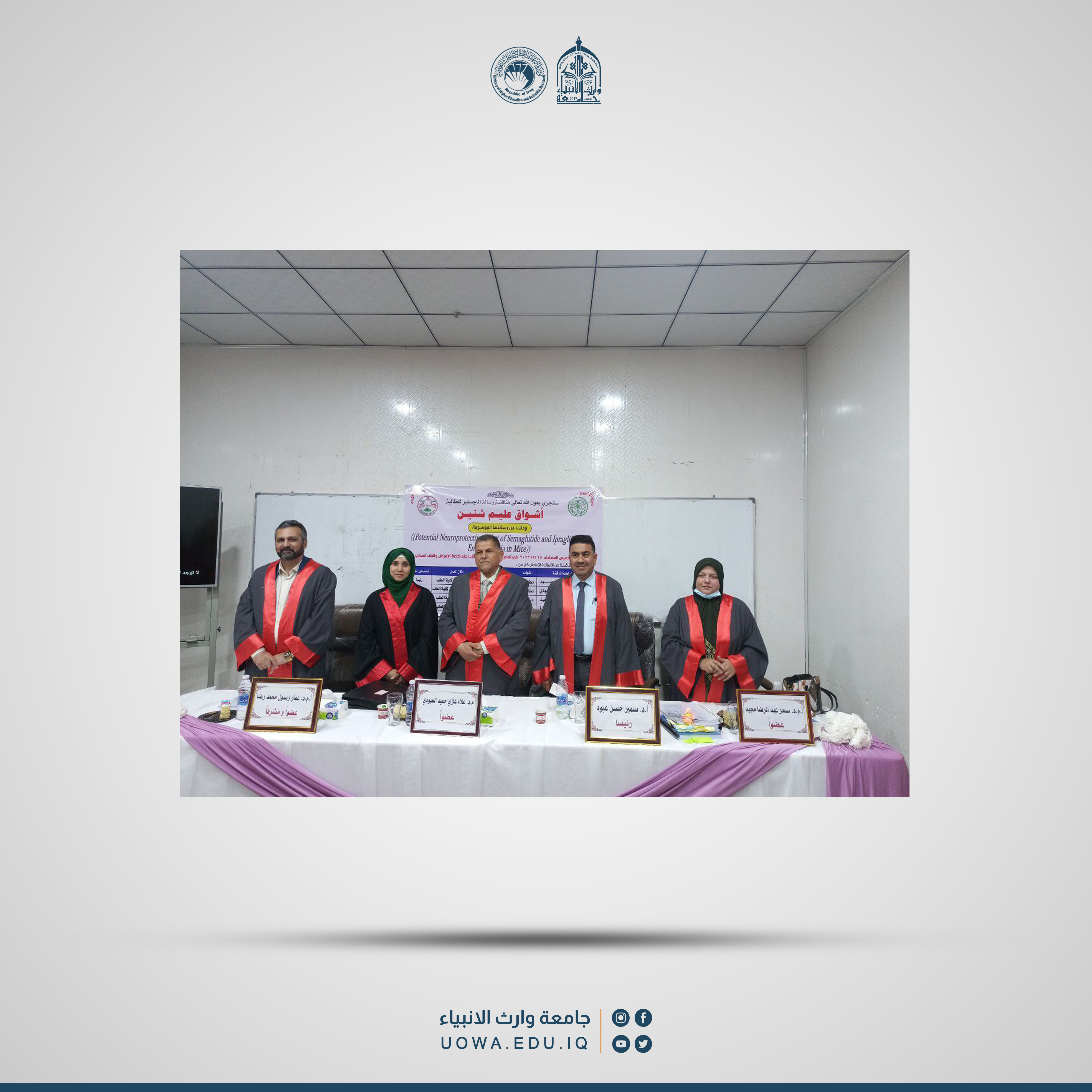 شارك رئيس فرع الادوية الدكتور علاء غازي حميد العبودي في كلية الطب/ بجامعة وارث الانبياء (عليه السلام) عضواً في مناقشة طالبة الماجستير (أشواق عليم شنين).
