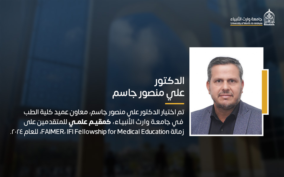 تم اختيار الدكتور علي منصور جاسم، معاون عميد كلية الطب في جامعة وارث الأنبياء (عليه السلام)، كمقيم علمي للمتقدمين على زمالة FAIMER، IFI Fellowship for Medical Education، للعام 2024.