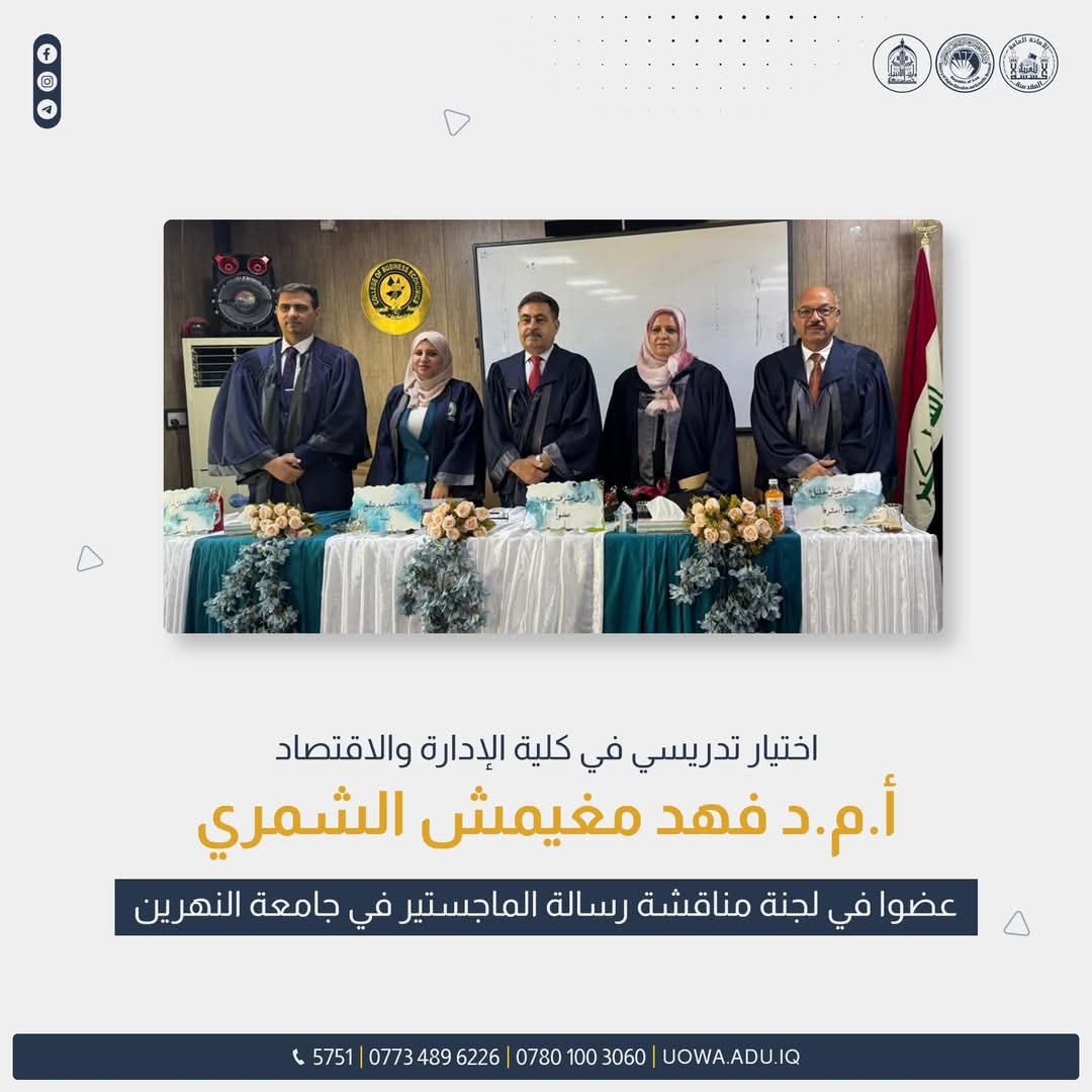 اختيار معاون عميد العلمي في كلية الادارة والاقتصاد عضوا في لجنة مناقشة رسالة ماجستير في جامعة النهرين