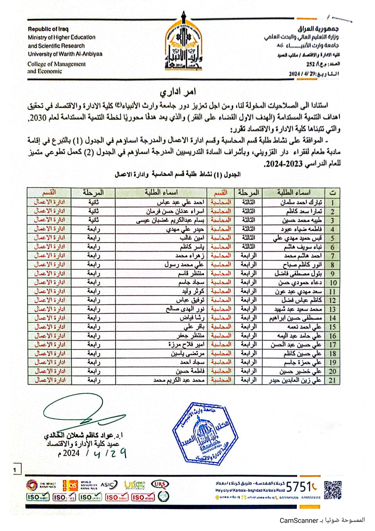 أقامت كلية الإدارة والاقتصاد، بمشاركة طلبتها، مأدبة طعام للفقراء في دار القزويني، ضمن إطار العمل التطوعي والجهود الإنسانية التي تهدف إلى دعم المجتمع.