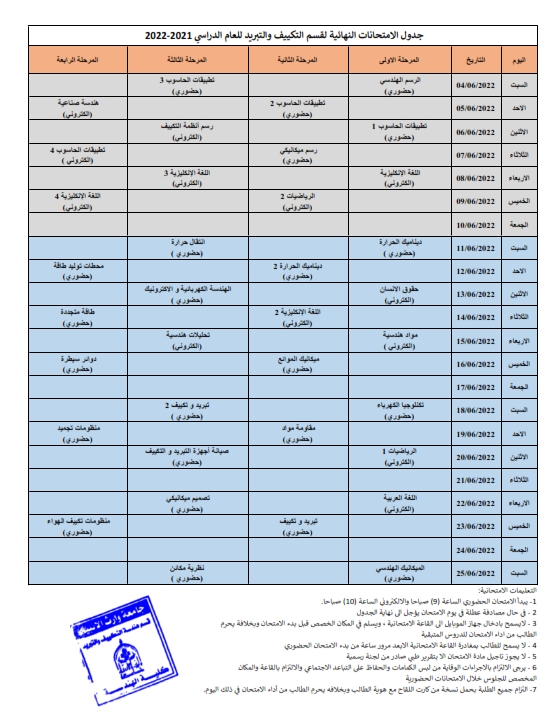جدول الامتحانات النهائية لقسم هندسة تقنيات التكييف و التبريد للعام الدراسي 2021-2022 الفصل الدراسي الثاني و للدراستين الصباحية والمسائية