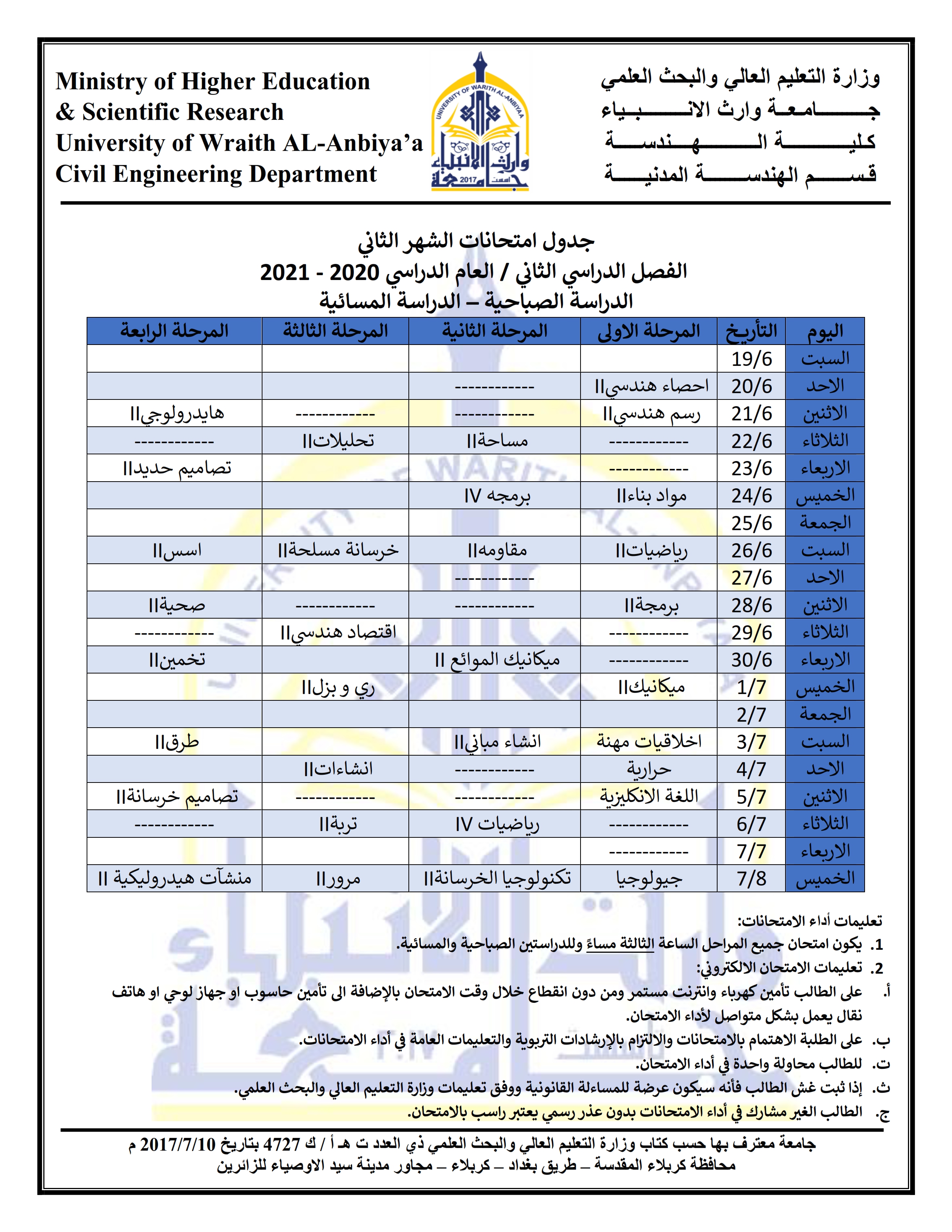 جدول امتحانات الشهر الثاني لطلبة قسم الهندسة المدنية و للدراستين الصباحية و المسائية