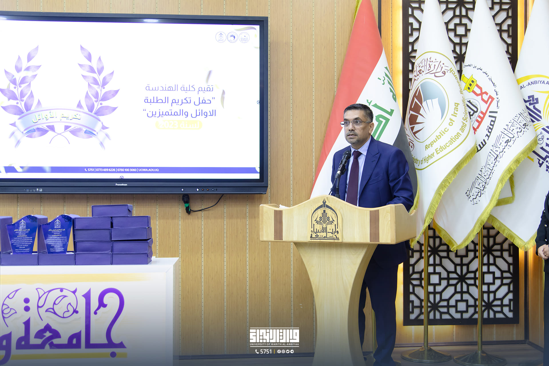 حيث قدم عميد كلية الهندسة خلال كلمته بالمناسبة شكره وتقديره لجميع ملاكات كلية الهندسة التدريسية والإدارية والطلبة لإلتزامهم العالي وتفوقهم والتأكيد على جميع الطلبة بالإجتهاد في طلب العلم وان يقتدوا بزملائهم المتفوقين.