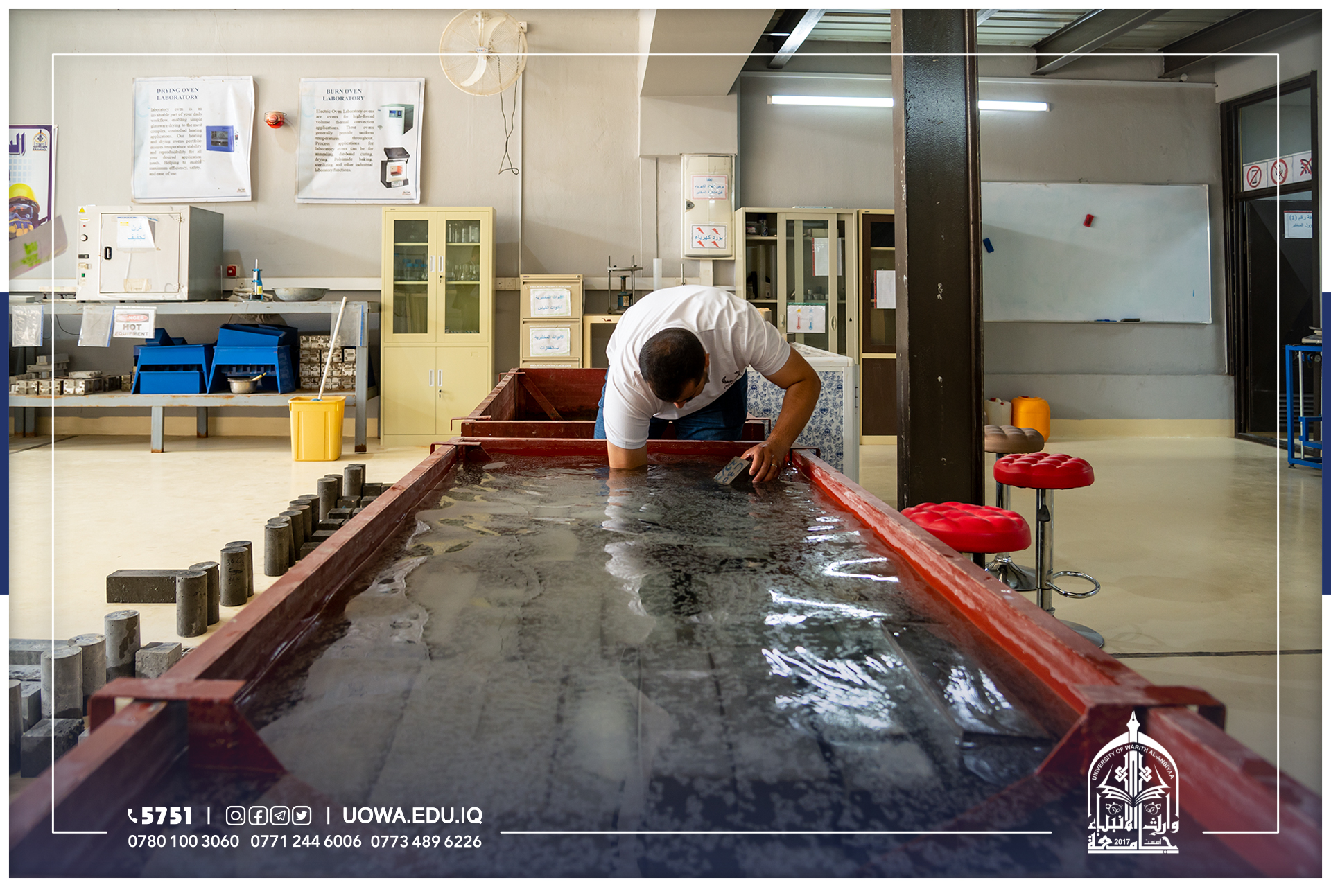 يعنى هذا المختبر بأجراء الفحوصات المختبرية للمواد الانشائية وكذلك الفحوصات المختبرية للإسمنت والمواد الخرسانية والركام (الرمل والحصى) وهذه الفحوصات ضرورية جدا لتمكن الطالب من معرفة كيفية خلط المواد مع بعضها البعض وبنسب معينه ودقيقه ومعرفة المشاكل التي تواجهه في حال لم يتم خلط المواد وفقا للنسب المحددة والظروف القياسية الملائمة التي تؤدي الى نجاح او فشل العينة ومدى مطابقتها للمواصفات الفنية من عدمه بالإضافة الى ذلك تمنح الفحوصات المختبرية دورا مهما يمكن المهندس من معرفة المادة الانشائية الجيدة وتمييزها والتي تؤدي الى زيادة عمر المنشأ