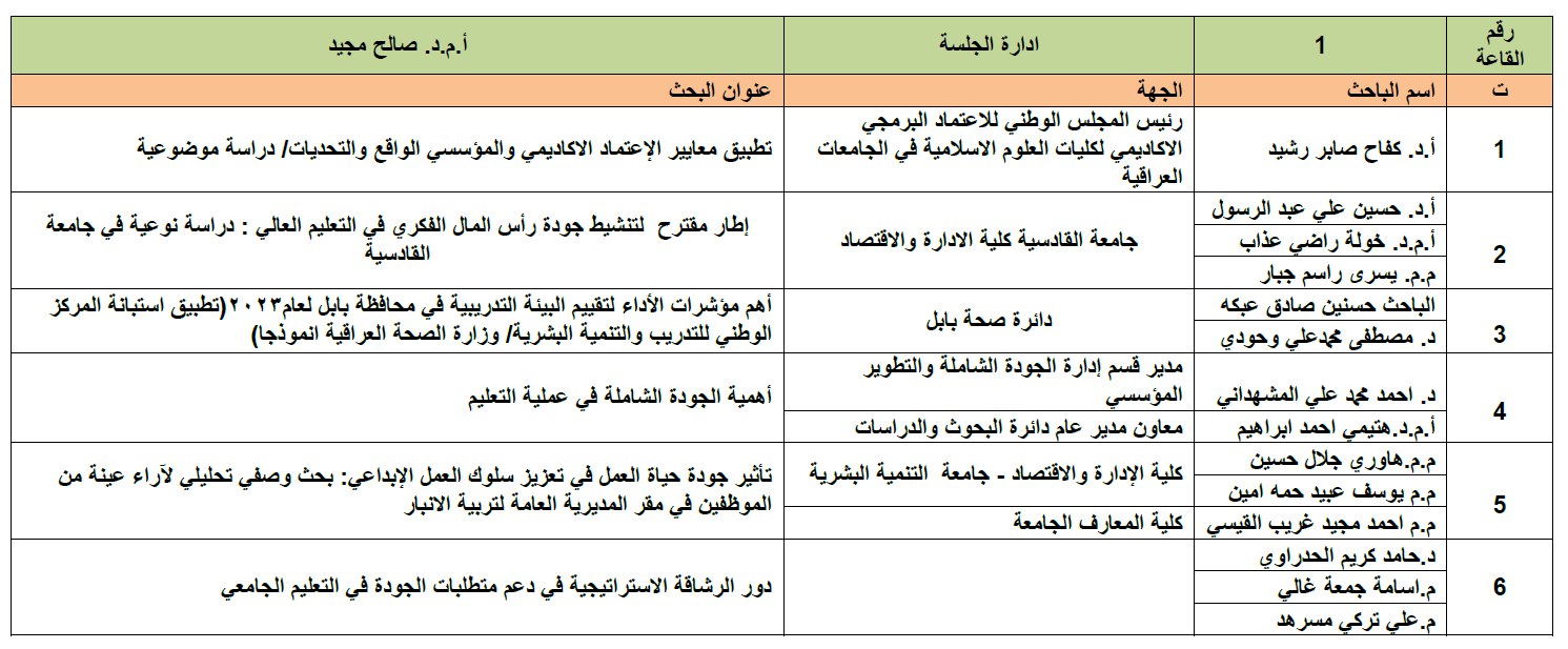تفقد الجلسات البحثية رئيس جامعة وارث الأنبياء الدكتور إبراهيم الحياوي حيث حضر فيها عدد من الأساتذة والباحثين والمهتمين بمجال فاعلية الجودة في تطوير الإداء المؤسسي. شهد المؤتمر عروضًا بحثية هادفة ونقاشات غنية أسهمت في إثراء المعرفة وتبادل الخبرات.