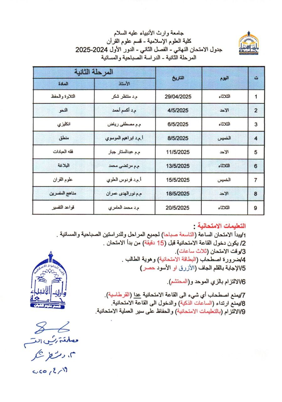 امتحانات الكورس الثاني قسم علوم القرآن في كلية العلوم الإسلامية تعلن كلية العلوم الإسلامية في جامعة وارث الأنبياء (عليه السلام) عن انطلاق امتحانات الكورس الثاني للعام الدراسي 2024-2025، وذلك ابتداءً من يوم الإثنين الموافق ٢٨ /٤/ 2024. وتدعو عمادة الكلية لجميع الطلبة التوفيق والنجاح في أداء امتحاناتهم، مع التأكيد على الالتزام بالتعليمات الامتحانية والحضور في المواعيد المحددة لكل مادة. كما تدعو الكلية الطلبة إلى الاستعداد الجيد ومراجعة المواد الدراسية لتحقيق أفضل النتائج. ملاحظات مهمة للطلبة: - يرجى التواجد في القاعات الامتحانية قبل بدء الامتحان بوقت كافٍ. - الالتزام بإحضار الهوية الجامعية وباقي المستلزمات المطلوبة. - يُمنع استخدام الأجهزة الإلكترونية أو أي وسائل غير مسموح بها أثناء الامتحان. كل التوفيق والنجاح لطلبتنا الأعزاء!