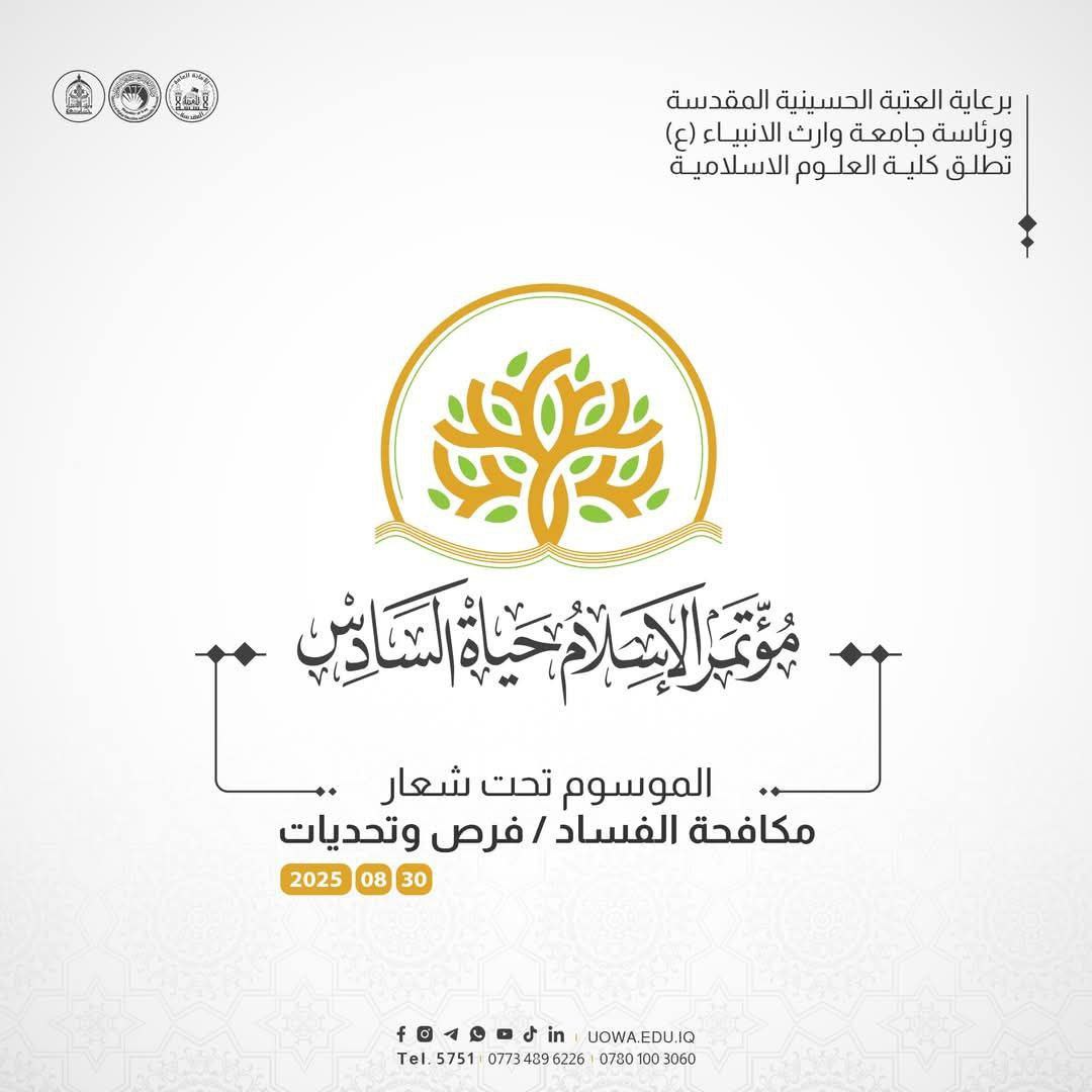 برعاية كريمة من الأمانة العامة للعتبة الحسينية المقدسة، وبإشراف مباشر من رئاسة جامعة وارث الأنبياء (عليه السلام)، تتشرف كلية العلوم الإسلامية بإطلاق فعاليات مؤتمرها العلمي الدولي السادس "الإسلام حياة" الموسوم: