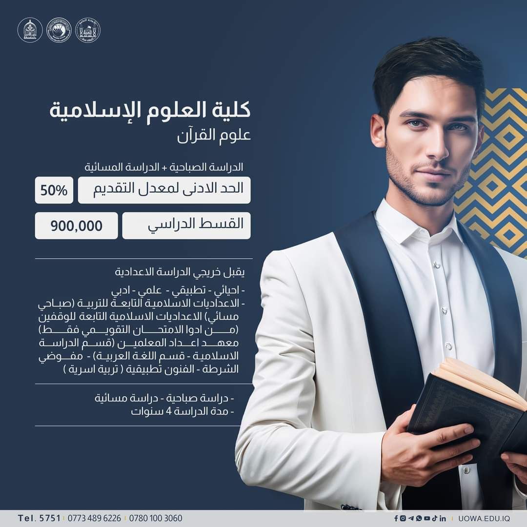 فرصة جديدة لخريجي الإعدادية: فتح باب التقديم لكلية العلوم الإسلامية في جامعة وارث الأنبياء تعلن جامعة وارث الأنبياء (عليه السلام) عن شمول خريجي الدراسة الإعدادية من فرع الفنون التطبيقية، قسم التربية الأسرية، بالتقديم لكلية العلوم الإسلامية، قسم علوم القرآن وقسم الفقه وأصوله. يُرجى من الطلبة الأعزاء زيارة فريق التسجيل المتواجد يوميًا من الساعة 8 صباحًا حتى 5 مساءً (باستثناء الخميس والجمعة، يكون تواجدهم من الساعة 8 صباحًا حتى 2 مساءً) للإجابة عن استفساراتكم ومساعدتكم في إتمام مراحل التقديم الأولى والثانية، بما في ذلك إنشاء حساب الطالب وملء البيانات. *سيتم إطلاق مراحل التقديم تباعًا عبر رابط البوابة الإلكترونية لدائرة التعليم الجامعي الأهلي.
