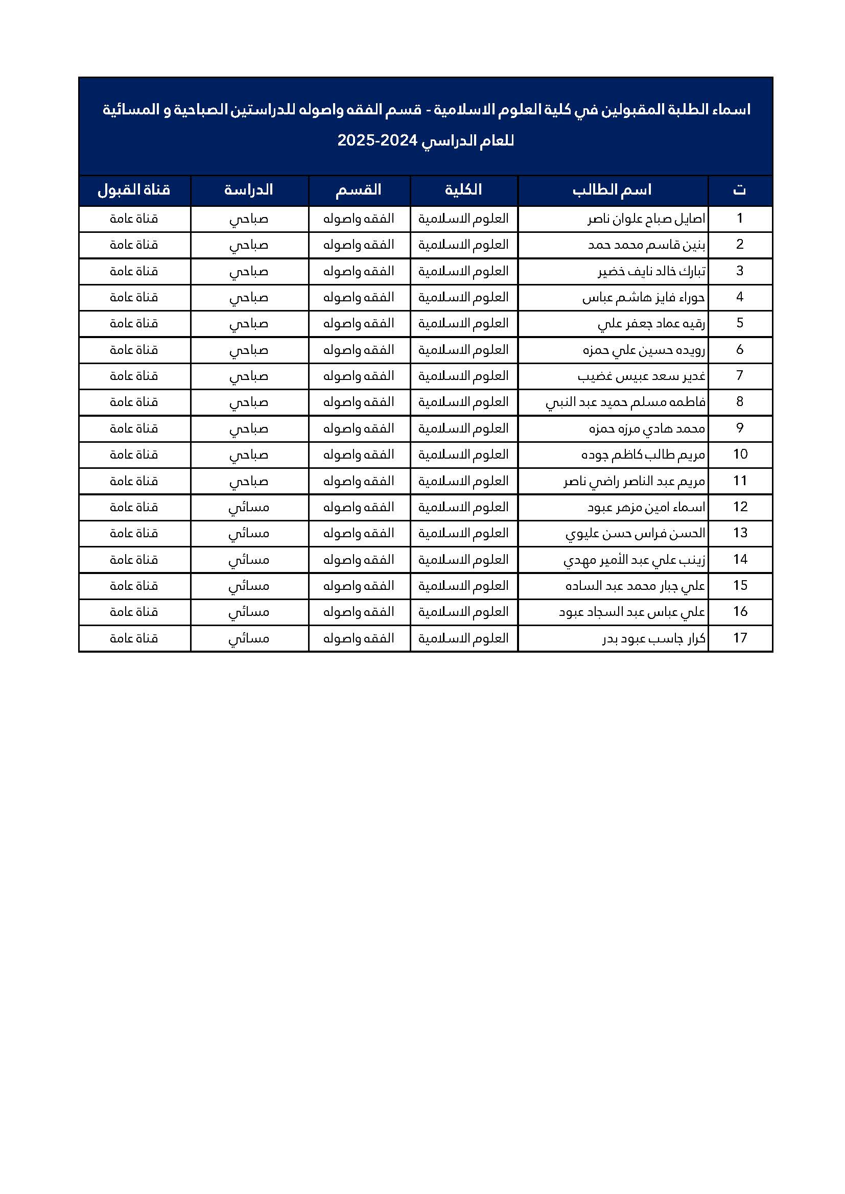 أسماء الطلبة المقبولين في كلية العلوم الإسلامية قسم الفقه وأصوله للعام 2024-2025