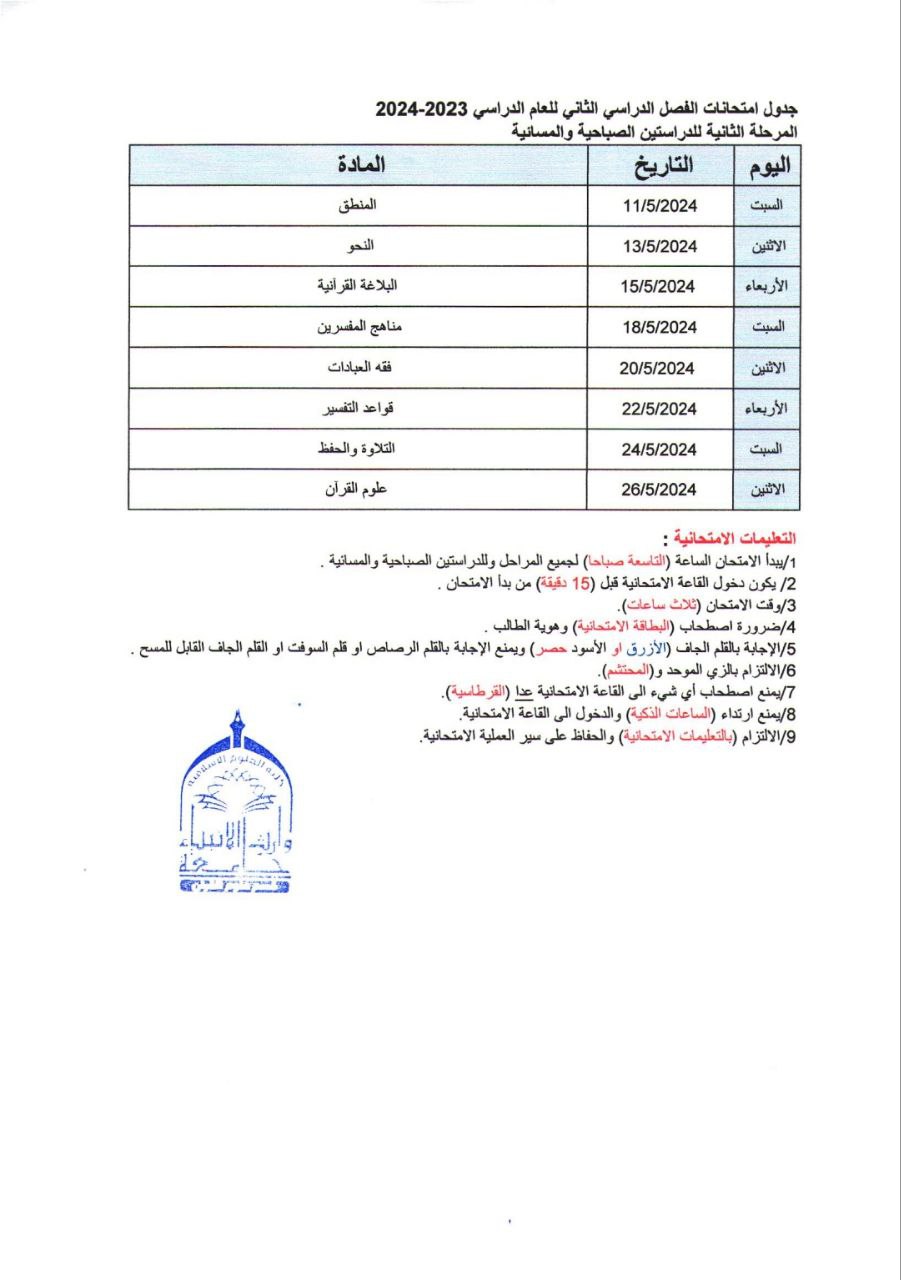 نرفق لكم جدول الامتحانات النهائية للفصل الثاني من العام الدراسي 2023-2024 و للمرحلة الثانية والثالثة مع التعليمات الامتحانية متمنين لكم دوام التوفيق و النجاح.