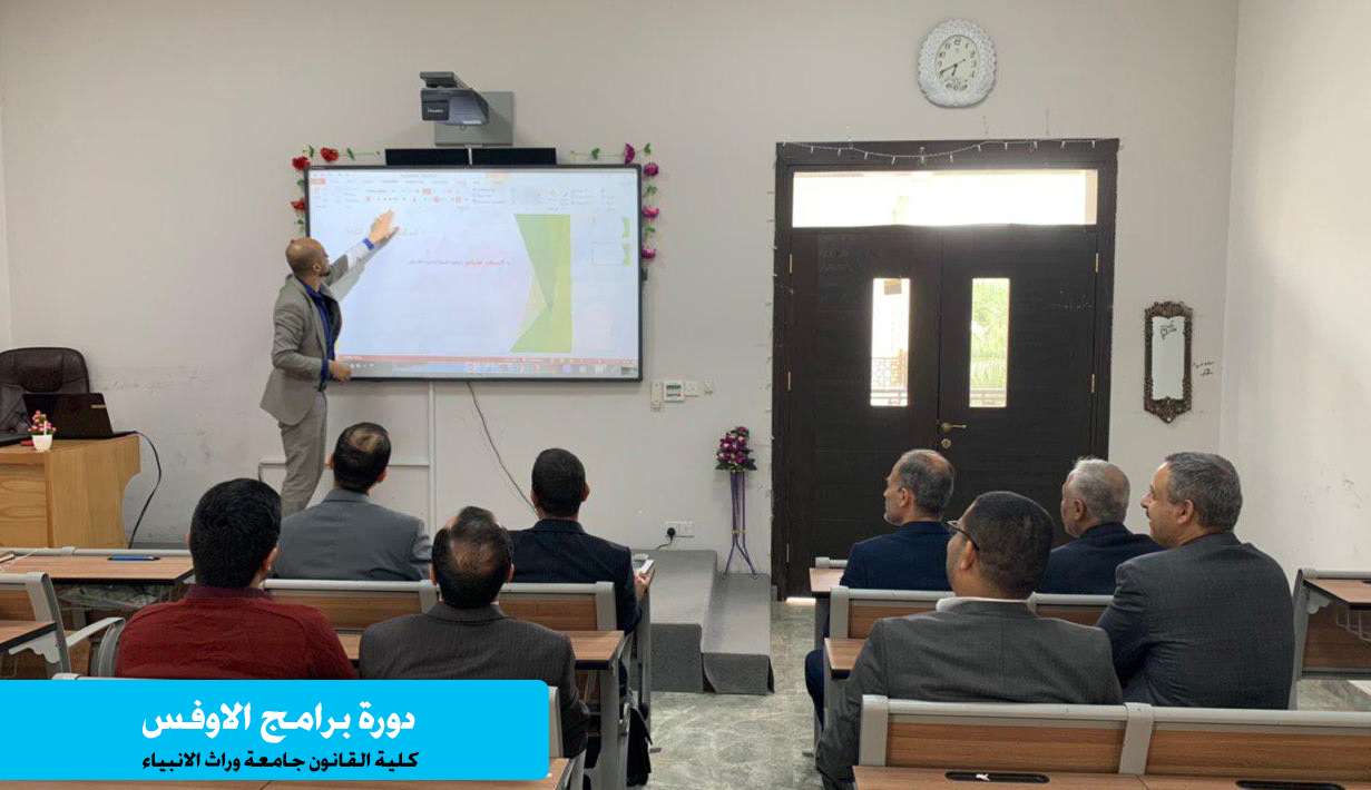 في سياق توجه جامعة وارث الأنبياء في استخدام التقنيات الحديثة لتطوير العملية التعليمية من خلال تطبيق نظام التعليم الالكتروني اقامت كلية القانون في الجامعة دورة تدريبية تحت عنوان (دور تطبيقات برامج الاوفس في تطوير طرائق التدريس) حيث تم استعراض برامج الخاصة بحزمة مايكروسوفت اوفس واهم المميزات التي تتيح للمستخدم العمل عليها , وكان المحاضر في الدورة م.م علي حميد. والفئة المستفيدة تحددت بالكادر التدريسي في كلية القانون .