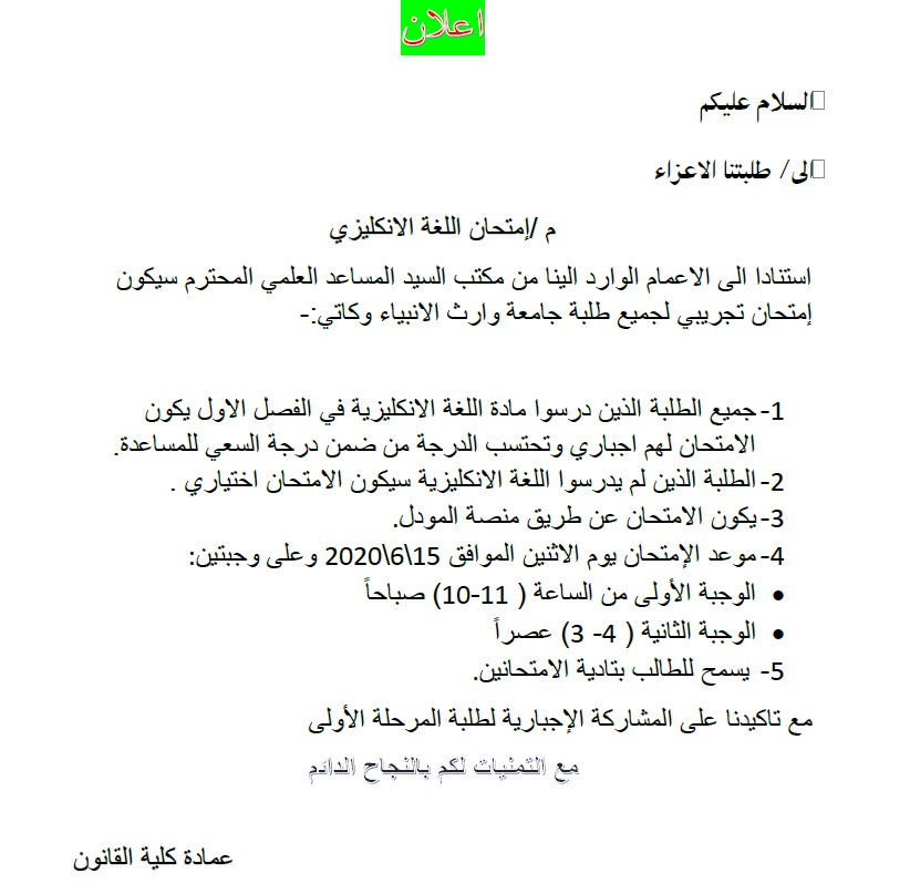 السلام عليكمالى/ طلبتنا الاعزاءم /إمتحان اللغة الانكليزياستنادا الى الاعمام الوارد الينا من مكتب السيد المساعد العلمي المحترم سيكونإمتحان تجريبي لجميع طلبة جامعة وارث الانبياء وكاتي:-1- جميع الطلبة الذين درسوا مادة اللغة الانكليزية في الفصل الاول يكونالامتحان لهم اجباري وتحتسب الدرجة من ضمن درجة السعي للمساعدة.2- الطلبة الذين لم يدرسوا اللغة الانكليزية سيكون الامتحان اختياري .3- يكون الامتحان عن طريق منصة المودل .4- موعد الإمتحان يوم الاثنين الموافق 15 \ 6 \ 2020 وعلى وجبتين : الوجبة الأولى من الساعة ) 11 - 10 ( صباح ا الوجبة الثانية ) 4 - 3( عصر ا5- يسمح للطالب بتادية الامتحانين .مع تاكيدنا على المشاركة الإجبارية لطلبة المرحلة الأولىعمادة كلية القانون