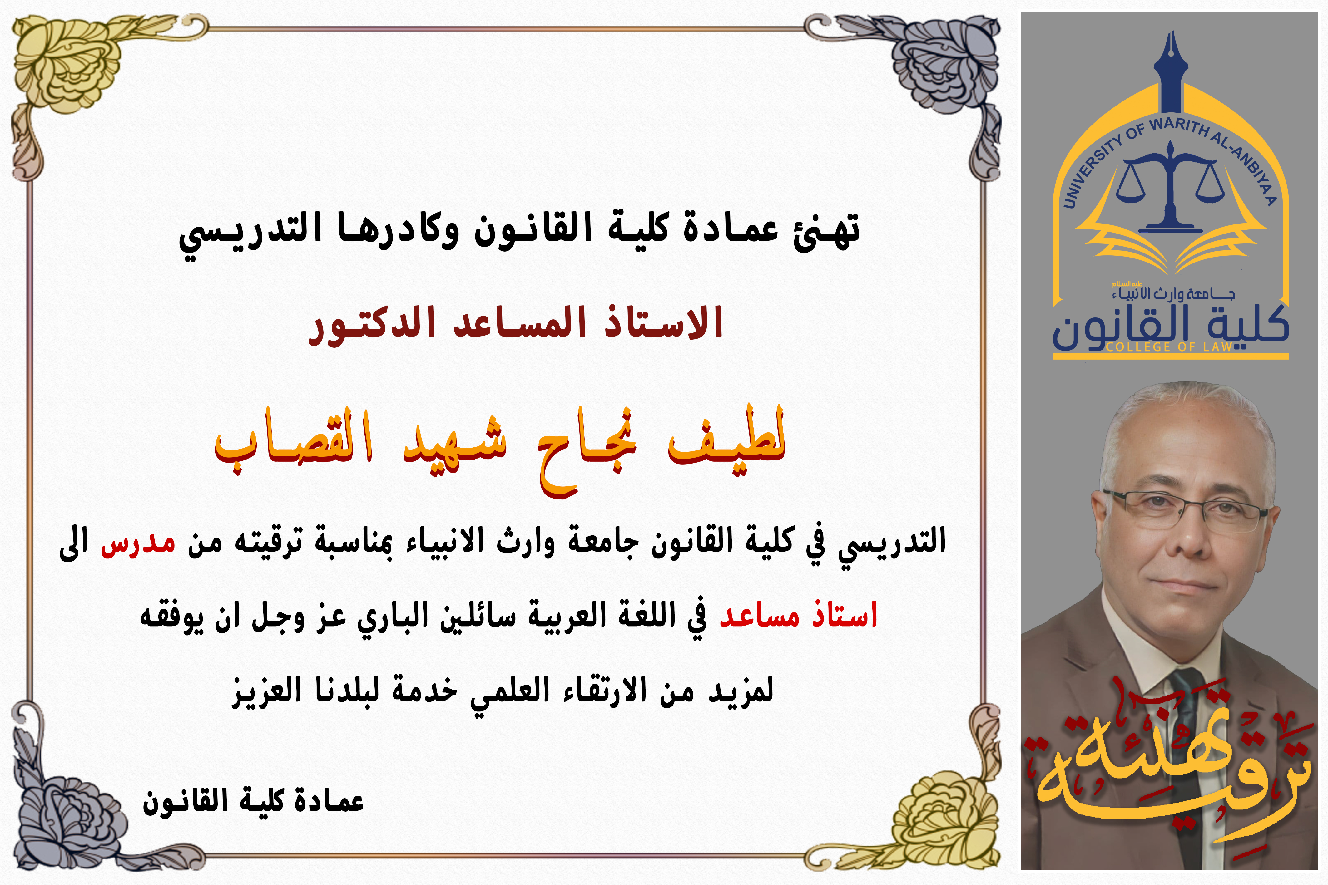 تهنئ عمادة كلية القانون وكادرها التدريسي الاستاذ المساعد الدكتور  لطيف نجاح شهيد القصاب التدريسي في كلية القانون جامعة وارث الانبياء بمناسبة ترقيته من مدرس الى استاذ مساعد في اللغة العربية سائلين الباري عز وجل ان يوفقه لمزيد من الارتقاء العلمي خدمة لبلدنا العزيز