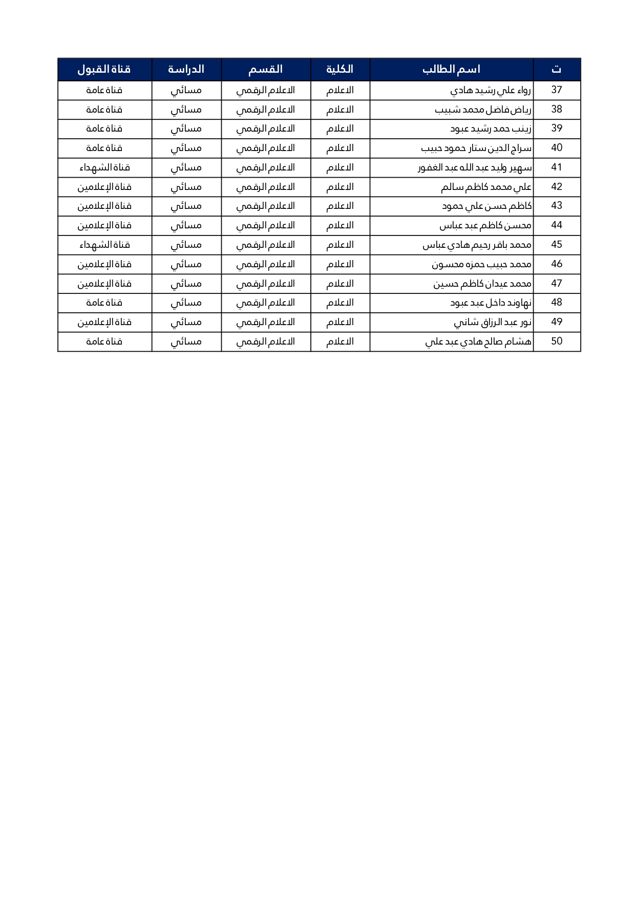 اسماء الطلبة المقبولين للدراسة الصباحية والمسائية للمرحلة الاولى كلية الاعلام قسم الاعلام الرقمي