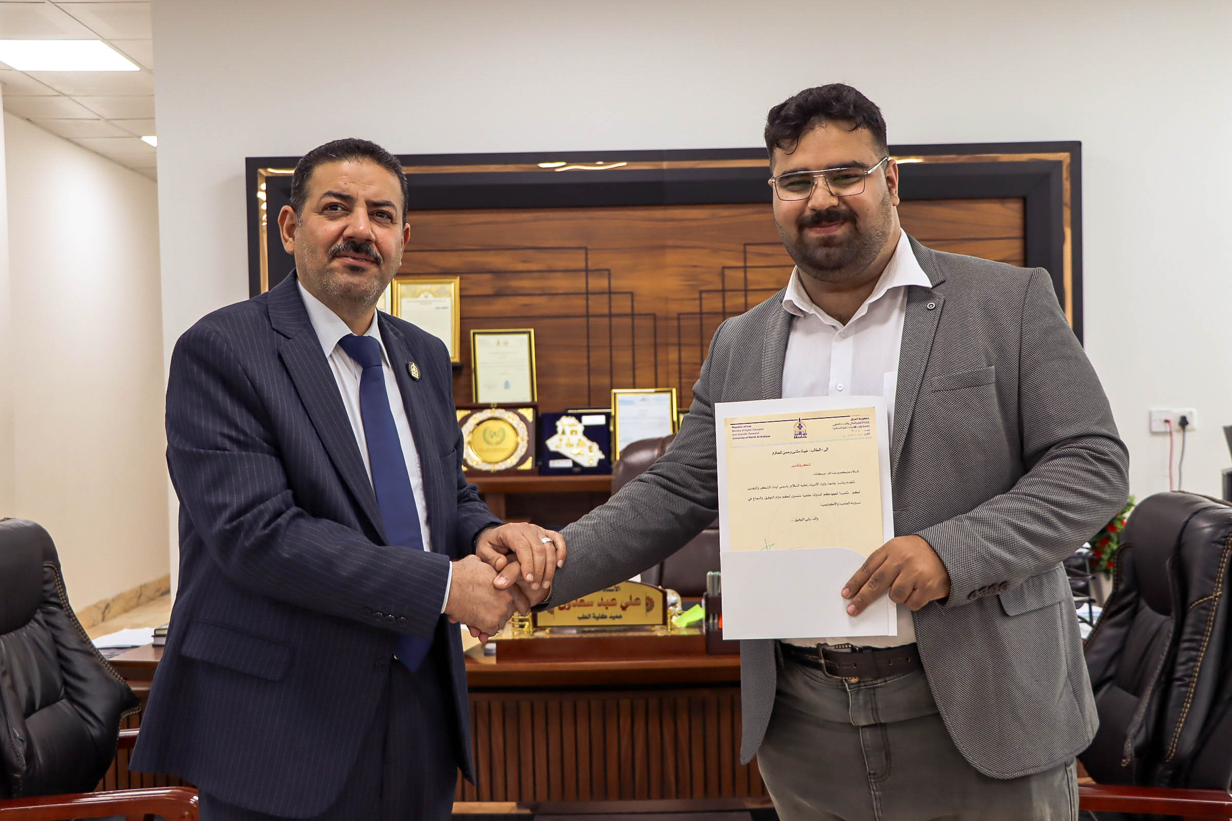 تتقدم كلية الطب في جامعة وارث الأنبياء (ع) بأسمى آيات الشكر والتقدير إلى الطالب غيث مثنى رحيم، تثمينا لجهوده العلمية ومشاركاته المتميزة ضمن مسيرته الأكاديمية. وإذ تعرب الكلية عن اعتزازها بما حققه من مستوى مشرف، فإنها تتمنى له دوام النجاح والتوفيق في مسيرته العلمية والمهنية خدمةً للمجتمع والوطن.