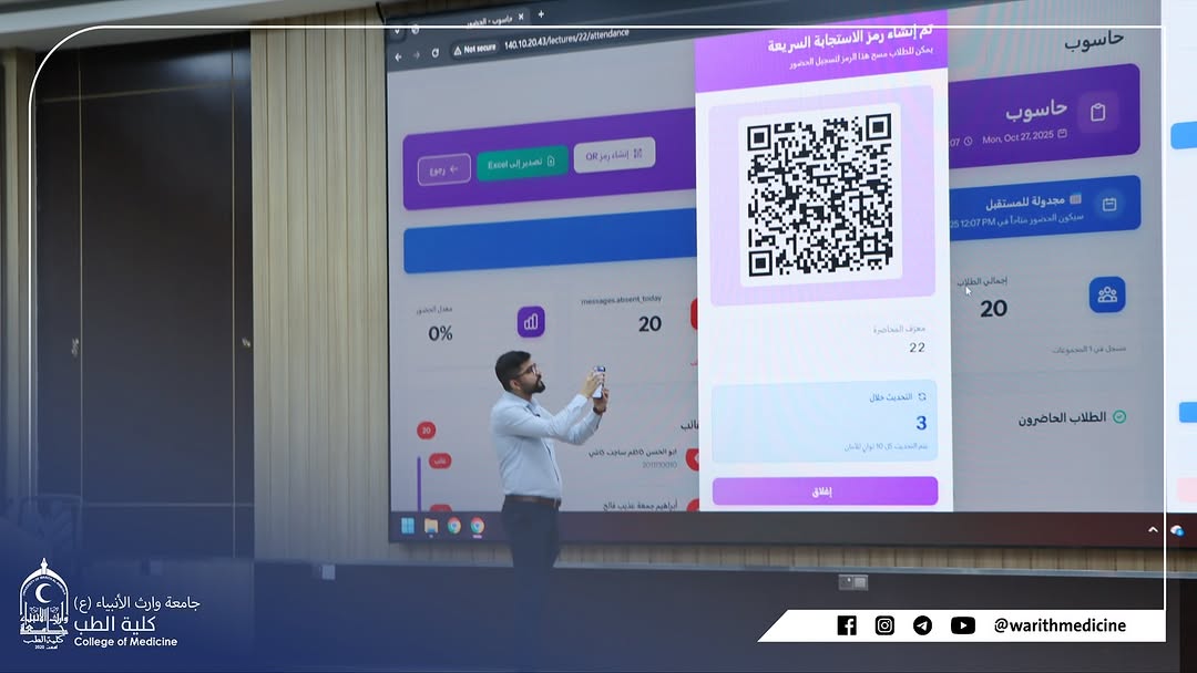 ضمن توجهات عمادة كلية الطب نحو التحول الرقمي وتطوير الخدمات الأكاديمية نظّمت بالتعاون مع مركز الحاسبة الإلكترونية ورشة تدريبية بعنوان برنامج إدارة حضور الطلبة في القاعات الدراسية والمختبرات والمستشفيات ألقاها المهندس مصطفى جمال سعدون هدفت الورشة إلى استعراض آلية استخدام النظام الإلكتروني الجديد لتسجيل حضور الطلبة عبر رمز الاستجابة السريع QR Code بدلاً من الطرق الورقية التقليدية مما يسهم في تسهيل متابعة الحضور وتعزيز دقة التقارير الأكاديمية وسرعة إنجازها وتأتي هذه الفعالية ضمن سلسلة النشاطات التقنية والتطويرية التي تنفذها كلية الطب في جامعة وارث الأنبياء عليه السلام دعمًا لخطط التحول الرقمي وتوظيف التكنولوجيا في تطوير البيئة الجامعي.