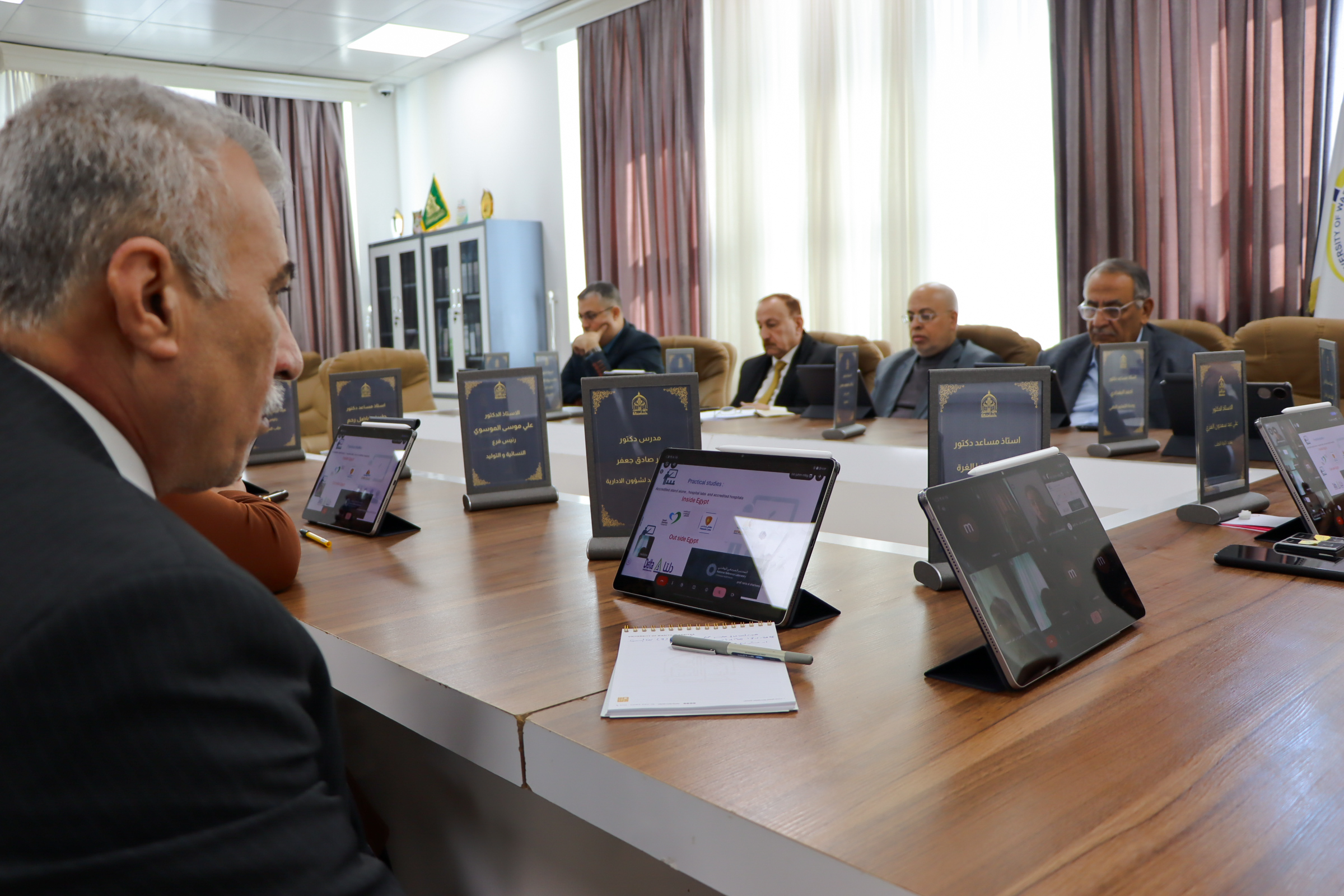 عقد مجلس كلية الطب اجتماعه التاسع، حيث تضمّنت الجلسة اعتماد مبادئ حوكمة عمل المجلس، إلى جانب إقرار استخدام الأجهزة اللوحية (iPad) في إدارة ومتابعة مقررات الجلسة، بما يسهم في تنظيم العمل الإداري وتسهيل تداول محاضر وقرارات المجلس بشكل إلكتروني.