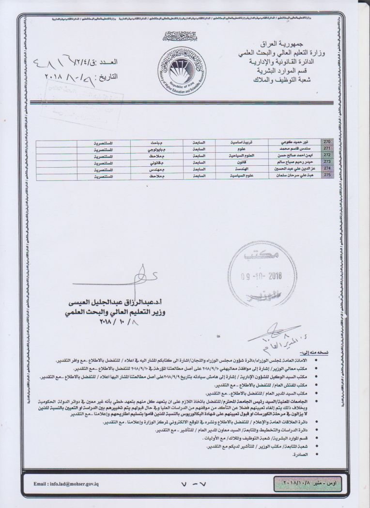 أعلنت وزارة التعليم العالي والبحث العلمي نتائج اعتراضات قناتي القبول المركزي وذوي الشهداء للسنة الدراسية 2019/2018.
