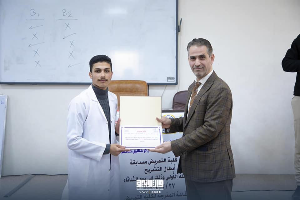 قدم السيد عميد كلية التمريض المحترم الأستاذ الدكتور مرتضى غانم الجبوري شهادة شكر وتقدير إلى الطالب امين رائد عباس لحصوله على المركز الأول في المسابقة القرآنية المقامة في جامعة الإمام الكاظم عليه السلام