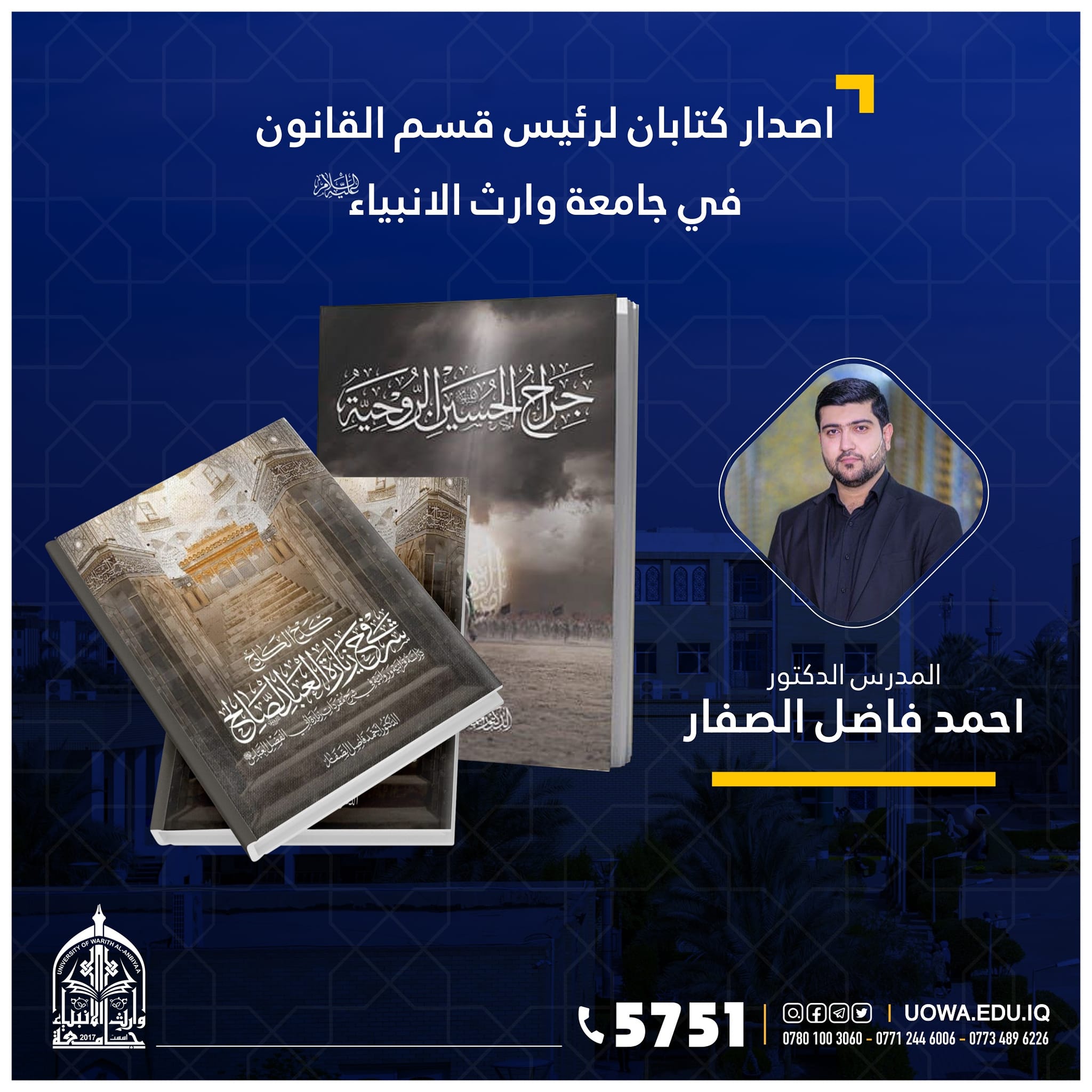 اصدار كتابان لرئيس قسم القانون في جامعة وارث الانبياء "عليه السلام" المدرس الدكتور احمد فاضل الصفار، الاول بعنوان (جراح الحسين عليه السلام الروحية) والثاني (كدح الكادح في شرح زيارة العبد الصالح).