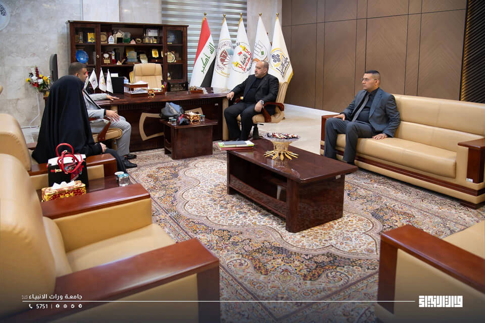 The President of the University of Warith Al-Anbiyaa (PBUH), Prof. Dr. Ibrahim Saeed Al-Hayawi, received a delegation from the Iraqi Syndicate for Training and Development, headed by Mr. Mohammed Al-Moussawi, who expressed his gratitude to the university’s leadership for its active participation in the syndicate’s conference held under the patronage of the Holy Shrine of Imam Hussein (PBUH), praising the speech delivered by the university on behalf of the Shrine at the event.