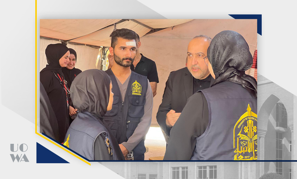 As part of his field supervision of services provided to the pilgrims of Imam Hussein’s (PBUH) Arbaeen, Professor Dr Ibrahim Saeed Al-Hayawi, President of the University of Warith Al-Anbiyaa (PBUH), inspected one of the medical posts operated by the university’s medical students in cooperation with the International Imamiyah Organisation.