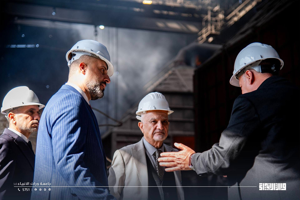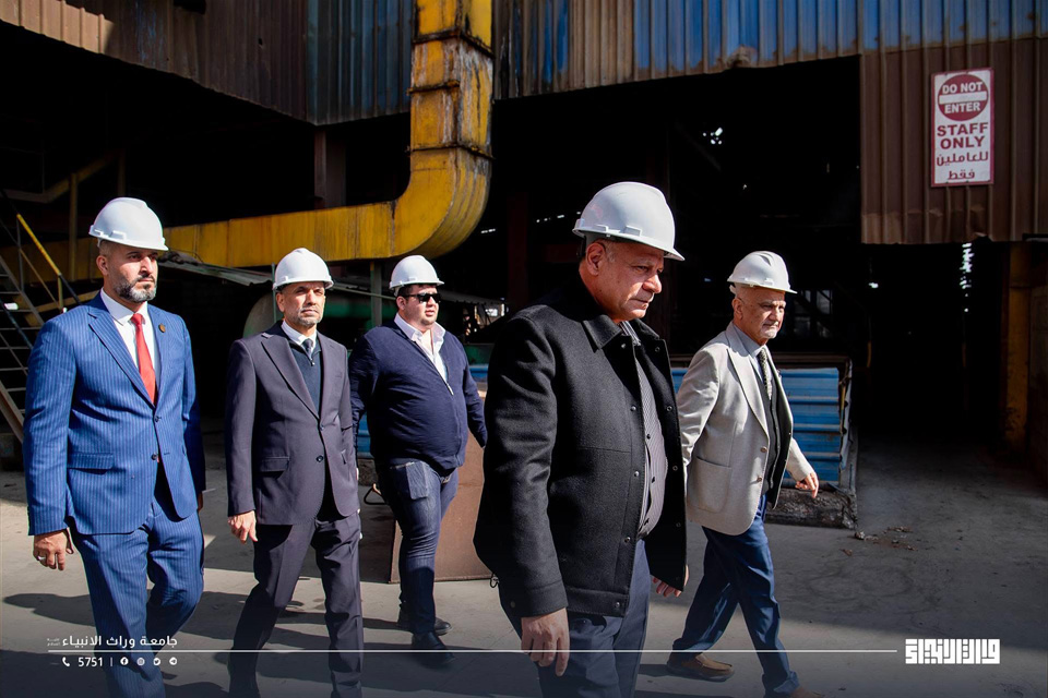 As part of its efforts to support productive sectors and enhance integration between academic education and practical application, a delegation from Warith Al-Anbiyaa University, headed by the Administrative Assistant to the University President, Prof. Dr. Nawfal Al-A‘raji, accompanied by the Dean of the College of Engineering, conducted a field visit to the Iron and Steel Plant in Karbala Governorate.