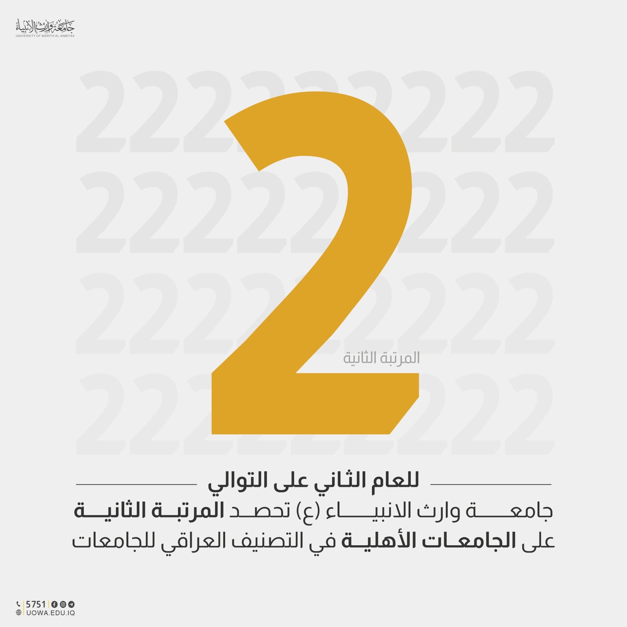 Warith Al-Anbiyaa University (PBUH) has achieved a new academic milestone by securing second place among private universities in Iraq for the second year in a row. This ranking was announced as part of the 2025 Iraqi University Classification results by the Ministry of Higher Education and Scientific Research.