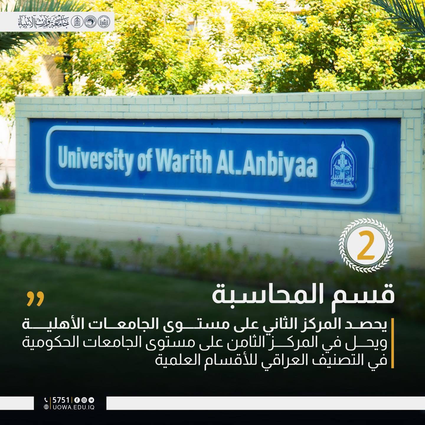 In a significant milestone, the Department of Accounting at Warith Al-Anbiyaa University (PBUH) has been ranked 1st among private universities and 8th overall (including public institutions) in the latest Iraqi Ranking for Scientific Departments. This success underscores the university’s commitment to academic excellence and its leading role in the Iraqi educational landscape.