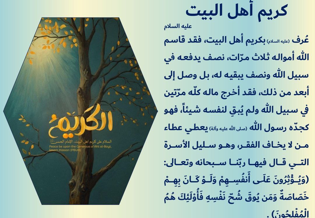 Imam Al-Hasan (peace be upon him) was renowned as "Kareem Ahlul Bayt" (The Generous One of the Household). He divided his wealth three times, giving away half of it in the way of Allah and keeping the other half for himself. Furthermore, he went beyond this by giving away his entire wealth twice, leaving nothing for himself.