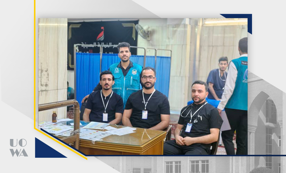 A number of medical students from the University of Warith al-Anbiya (peace be upon him) participated as part of the medical cadres in the specialized detachments of the Ambassador of Imam Hussein (peace be upon him) Hospital, to provide health services and first aid to the visitors of Imam Hussein and Abu al-Fadl al-Abbas (peace be upon them), during the flag-changing ceremony on the first of Muharram.