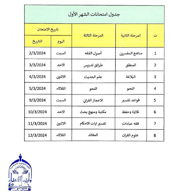 Schedule of second month exams for the second semester of the academic year 2023-2024, Department of Qur’anic Sciences